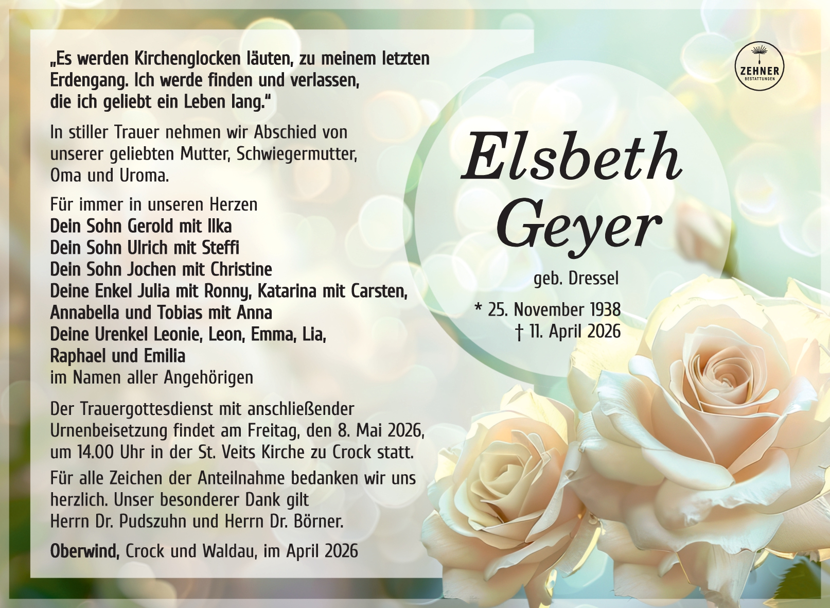 Der Trauergottesdienst mit anschließender Urnenbeisetzung findet am Freitag, den 8. Mai 2026, um 14.00 Uhr in der St. Veits Kirche zu Crock statt.