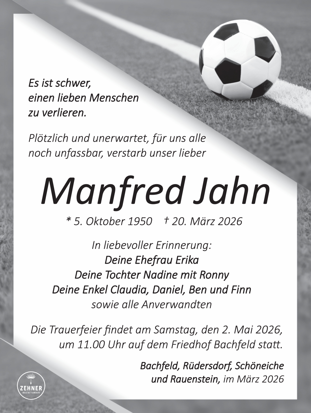 Die Trauerfeier findet am Samstag, den 2. Mai 2026, um 11.00 Uhr auf dem Friedhof Bachfeld statt.