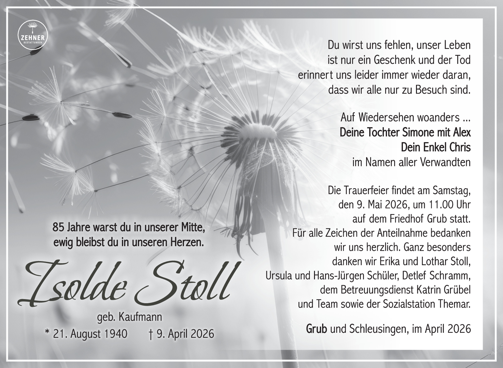 Die Trauerfeier findet am Samstag, den 9. Mai 2026, um 11.00 Uhr auf dem Friedhof Grub statt.