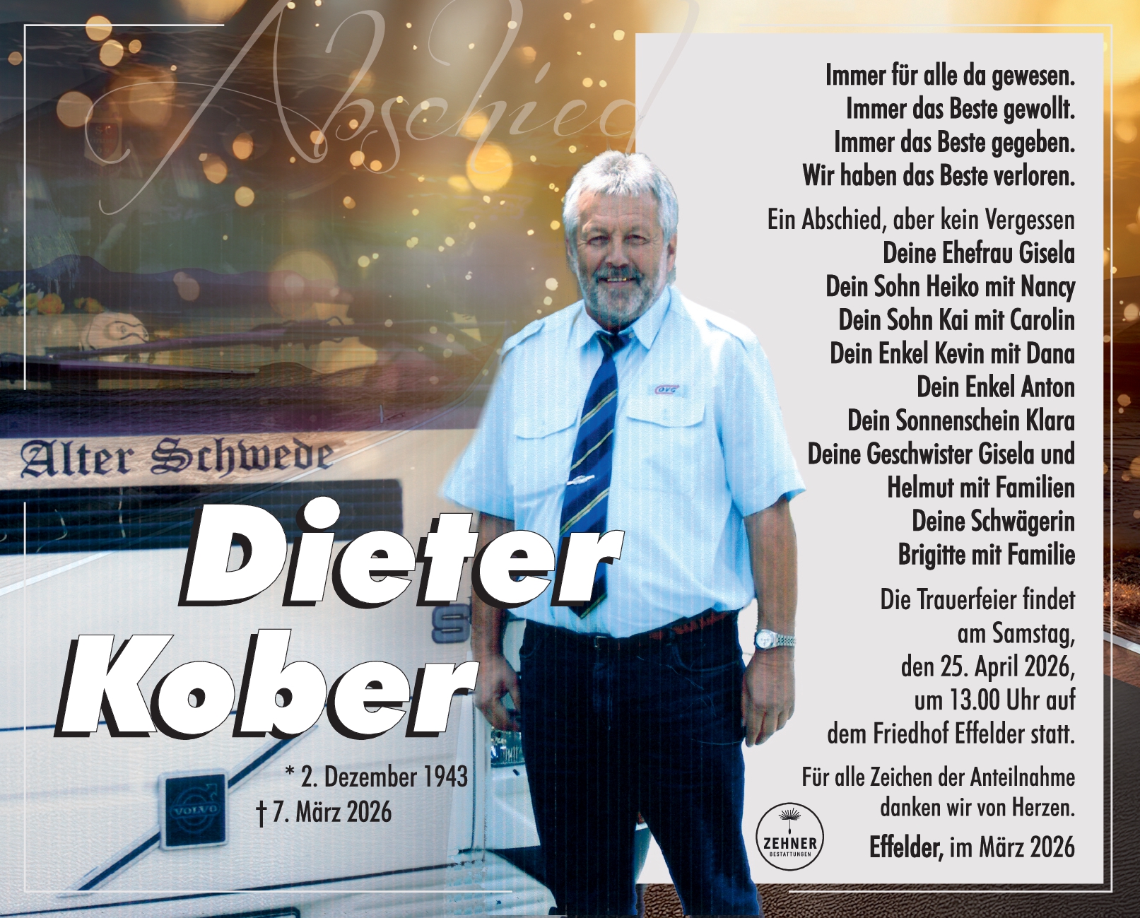 Die Trauerfeier findet am Samstag, den 25. April 2026, um 13.00 Uhr auf dem Friedhof Effelder statt.